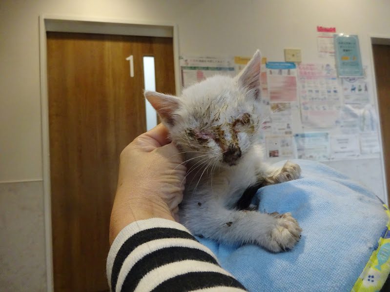 先日オンちゃんを保護した小学生が、冷たい雨の降る中、近くの漁港に弱っている子猫がいるとスタッフのところに連れてきました。よほど食べるものが無かったのか口の中には土や小石が入っていました。ひどい猫風邪のため目も鼻も完全に詰まりガリガリに痩せて、低体温で危険な状態だった為、現在入院治療中です。舌には潰瘍、鼻の奥も腫れがあり、まだ自力で食べることができず病院で強制給仕をしてくれています。キジ白の小さな女の子です。