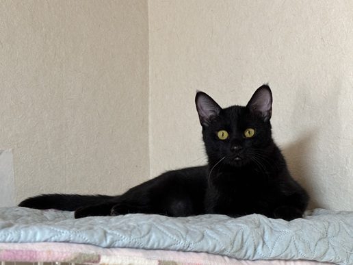 • 観光施設に弱った子猫がいると保護されました。風邪症状がありましたが、治ってきました。可愛い黒猫の男の子。お腹と胸の一部が、白毛です。人馴れしています。