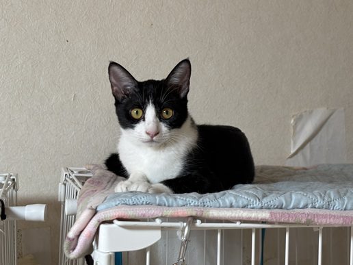 海岸で倒れているところを保護されました。飼われていて捨てられたのか、とても人馴れしています。白黒のスリスリの男の子。布などを食べてしまうウールサッキングの症状があります。