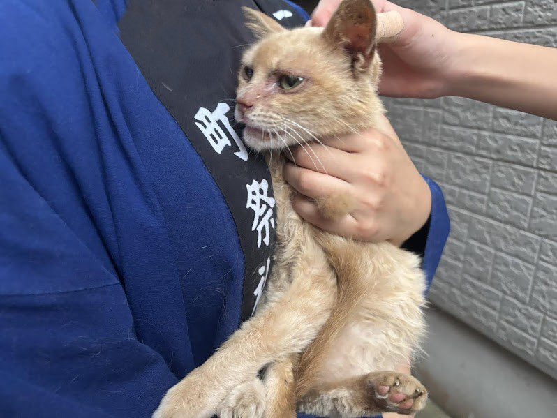 スタッフの地元で行われていた祭りのだんじりに痩せた猫がついてきていて、だんじりが倒れた際に「下敷きになりそうになっていたから助けてあげて欲しい」とだんじりに乗っていた女の子がスタッフのところに連れてきました。預かりスタッフ宅も保護部屋も満杯で受け入れできる状態ではないのですが、TNRも検討することにして引き取りました。まだガリガリに痩せているためすぐに手術をすることができません。とても人馴れした茶トラの女の子です。緊急で里親さんを募集しています。