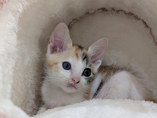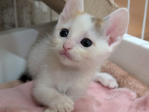 沢山の成猫、子猫がいるTNRの現場で保護出来ていなかった状態の悪い子猫がまだいると相談があり、保護猫数の多いワンニャンクラブではもう保護できる状態ではありませんでしたが受け入れることになりました。ひどい猫風邪をひいていましたが、ずいぶん良くなってきています。抱っこ大好き、お膝が大好き、とても甘えん坊の女の子です。