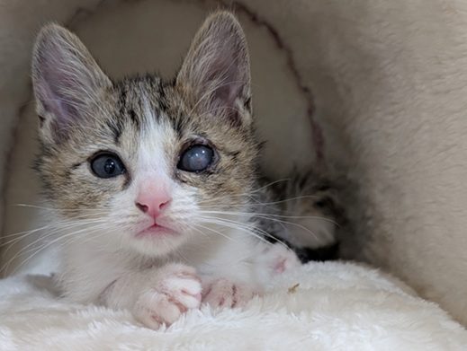 スタッフが家の2階から隣の空き地を見たところ、小さな子猫の姿があったため保護しました。顔の右半分が腫れあがりガリガリに痩せていたため病院に連れて行き、そのまま入院となりました。毒蛇に噛まれたかもしれないそうですが、元気になり退院しました。先住猫がいない場合は同じくらいの月齢の子猫と一緒に迎えてくれる里親さん募集中です。