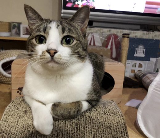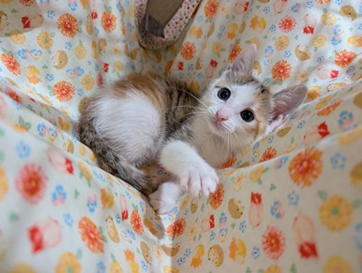 • おもちくんと兄弟です。トンビに襲われそうになっているところを保護されました。ガリガリに痩せていて、ひどい風邪をひいていましたが回復しています。怖がりで人馴れ修行中。ちゅーるやネコジャラシは大好きです。