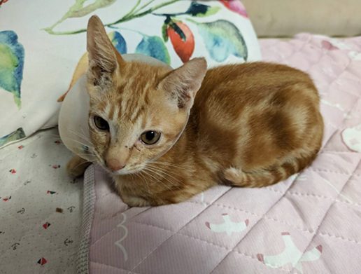 ある公園にガリガリの子猫がいると相談があり保護しました。人馴れした可愛いムギワラの女の子です。左腕骨折のため手術を受けましたが、後遺症はありません。